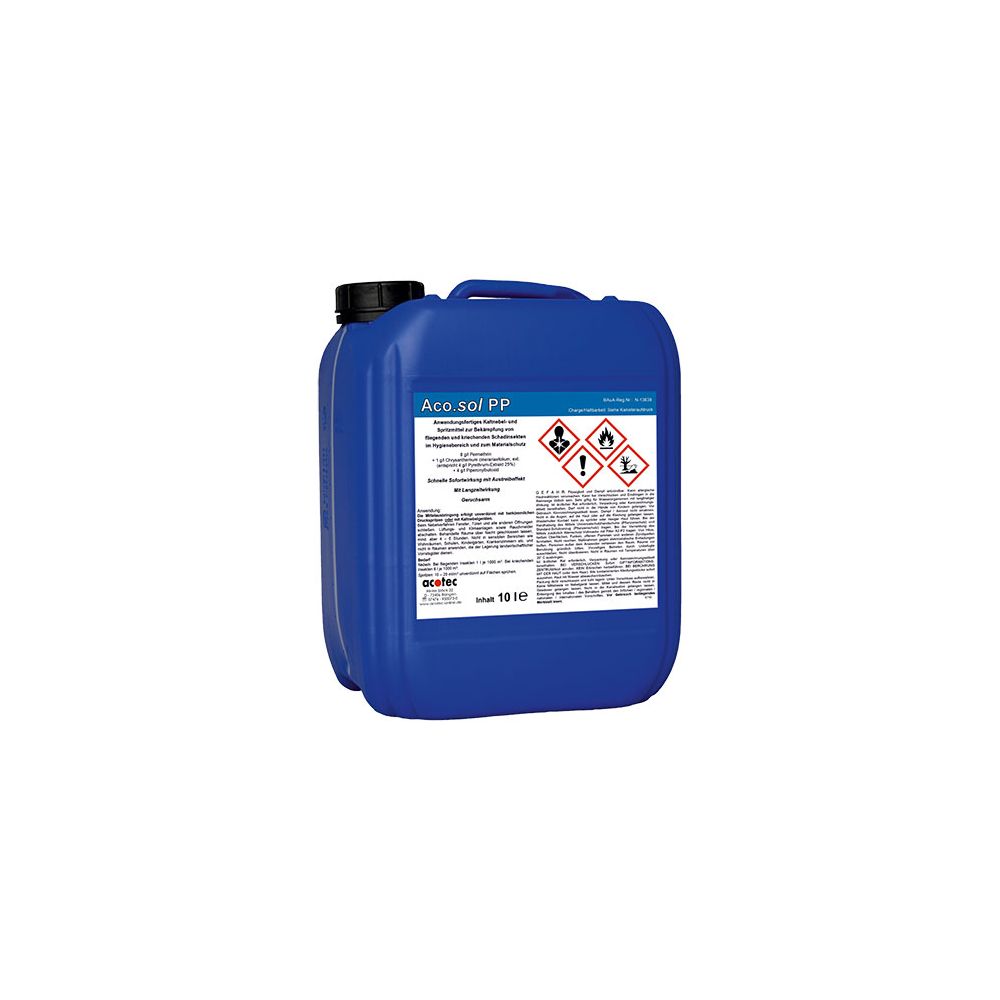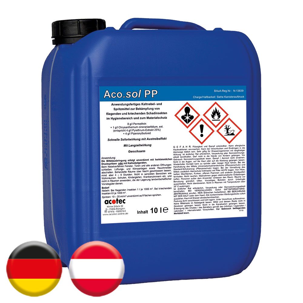 | Dosierung | kriechende Insekten: 6 l für 1000 m³ fliegende Insekten: 1 l für 1000 m³ Spritzverfahren: 20 ml für 1 m² |