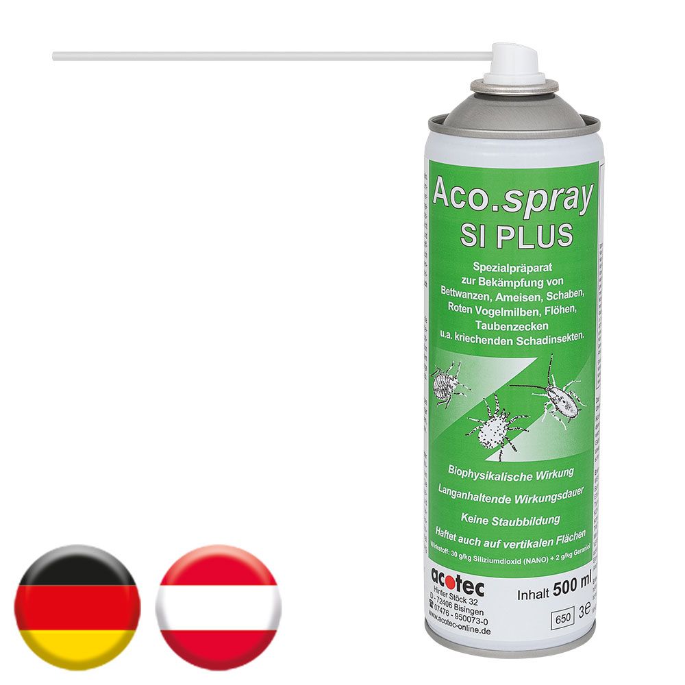 | Dosierung | Für alle sensiblen Bereiche geeignet. Anwendung auch im Lebensmittel- und Hygienebereich und in der Stallhygiene, z.B. Geflügelhaltung (auch in belegten Ställen). Aco.Spray SI PLUS wird direkt auf die befallenen und verdächtigen Stellen sowie deren Umgebung im Abstand von ca. 30 cm aufgesprüht. Eine Dose reicht für die Behandlung von ca. 60 lfm. |