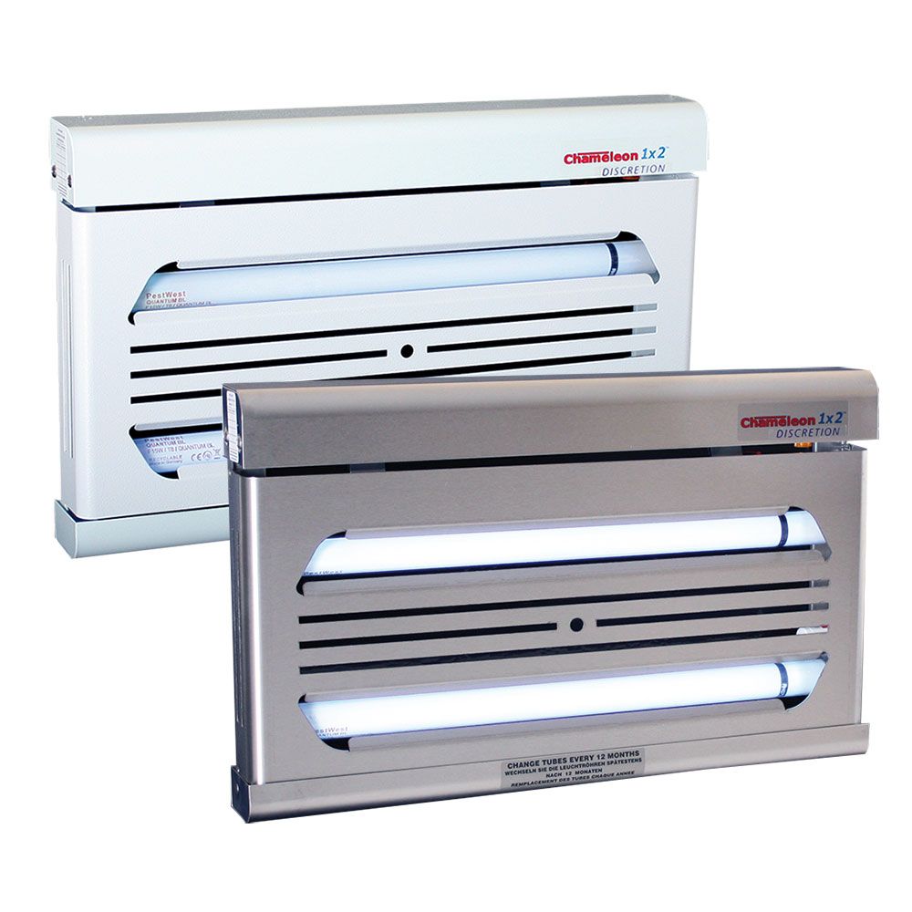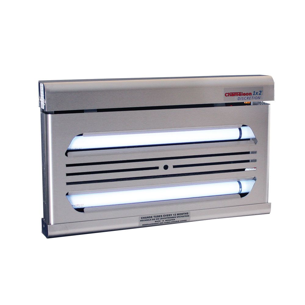Diskretes und schlankes Wandgerät (auch als Standgerät verwendbar – Sonderausstattung). Eine attraktive Blende verbirgt die Klebefläche und den Insektenfang. Das Gerät ist dadurch ideal für Bereiche mit Publikumsverkehr. Dieses Chameleon 1x2 weist ähnliche Charakteristiken wie das Standard 1x2 auf, ist aber mit der zusätzlichen Diskretionsblende ausgerüstet.