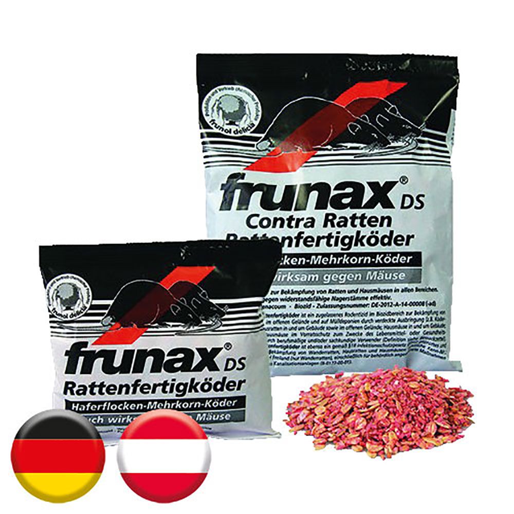 Bei frunax® DS Rattenfertigköder handelt es sich um einen rot gefärbten Schüttköder in Wahlweise 100 g oder 200g Portionsbeutel, der den Wirkstoff Difenacoum (0,05 g/kg) enthält. Das Präparat ist aus hochwertigen pflanzlichen Köderstoffen, wie Haferflocken und Weizenkörner, hergestellt, die speziell auf das Fressverhalten der benannten Schadnager