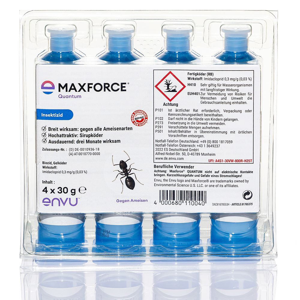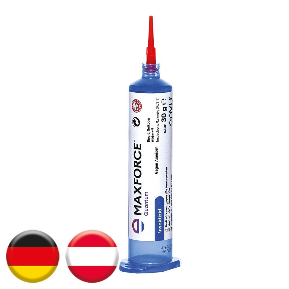 Die Erfassung des gesamten Nestes steht bei der Anwendung von Maxforce® Quantum von ENVU im Vordergrund. Der hochattraktive Sirupköder wird schnell als Futterquelle von den Arbeiterameisen angenommen und in ausreichendem Maße in die Ameisenkolonie eingetragen. Die Formulierung ist hydroskopisch (trocknet nicht aus), bildet keinen Oberflächenfilm und ist damit optimal für die Ameisen aufnehmbar. Ein verzögerter Wirkungseintritt ist für eine erfolgreiche Behandlung unbedingt notwendig, um eine permanente Problemlösung (Abtötung der Königin und Brut) zu erzielen. Eine deutliche Reduzierung der Ameisenaktivität wird bereits nach wenigen Tagen sichtbar. Der Zusammenbruch der gesamten Kolonie folgt in der Regel nach 2 - 3 Wochen.
