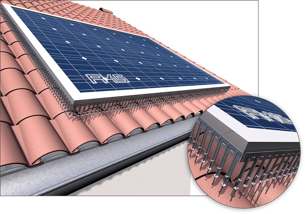 Die PV-Spikes sind speziell für die seitlich umlaufende Montage an Photovoltaik und Solarthermie-Panels konzipiert, um das Unterkriechen von Tauben unter die Panels zu verhindern. Tauben nutzen diesen Unterschlupf sehr häufig, um weitestgehend witterungsgeschützt einen Schlaf- oder Nistplatz einzurichten. Mit den PV-Spikes wird der Zugang wirksam verwehrt! Die senkrecht nach unten fallenden, selbstnivellierenden Spikes mit einer Höhe von 110 oder 170 mm Länge sind in einer Edelstahlhülse geführt.