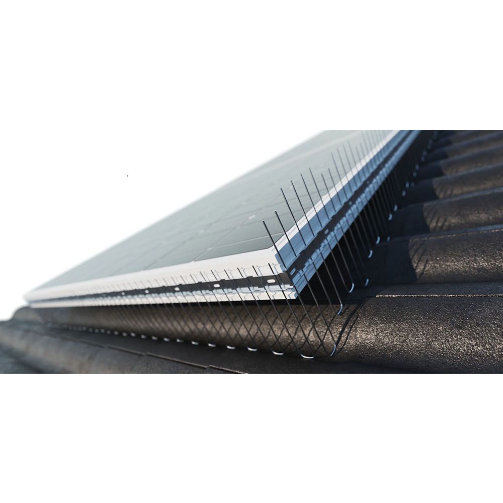 Solarspikes zum Schutz von Photovoltaikanlagen, um das Unterkriechen von Tauben unter die Panels zu verhindern. Durch das patentierte Steckprinzip passen sich die verstellbaren Solarspikes jeder Rundung optimal an. Die 1-reihigen Spitzen bestehen aus rostfreiem Edelstahl, Werkstoff-Nr. 1.4301 unbehandelt, und lassen sich einfach am seitlichen Rahmen der Solarmodule aufkleben. Bei eventueller Demontage entsteht keine Beschädigung der Paneele.